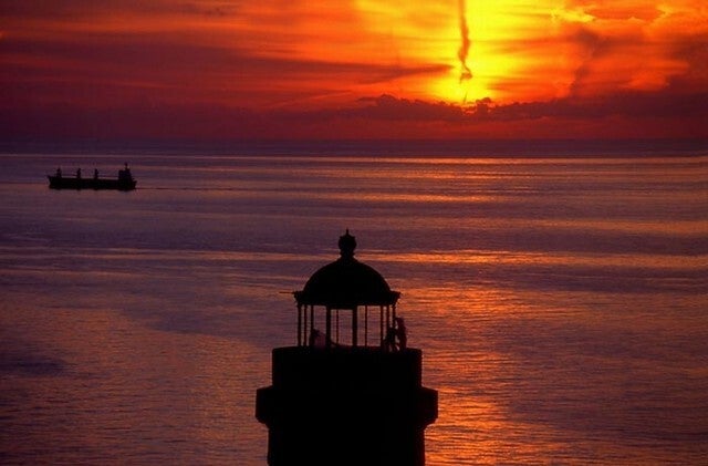 Al tramonto: Un’atmosfera magica con il sole che tinge il mare di rosso e arancione.